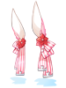 활짝 솟은 붉은색 토끼 귀 모양의 독특한 머리 장식 리본. |